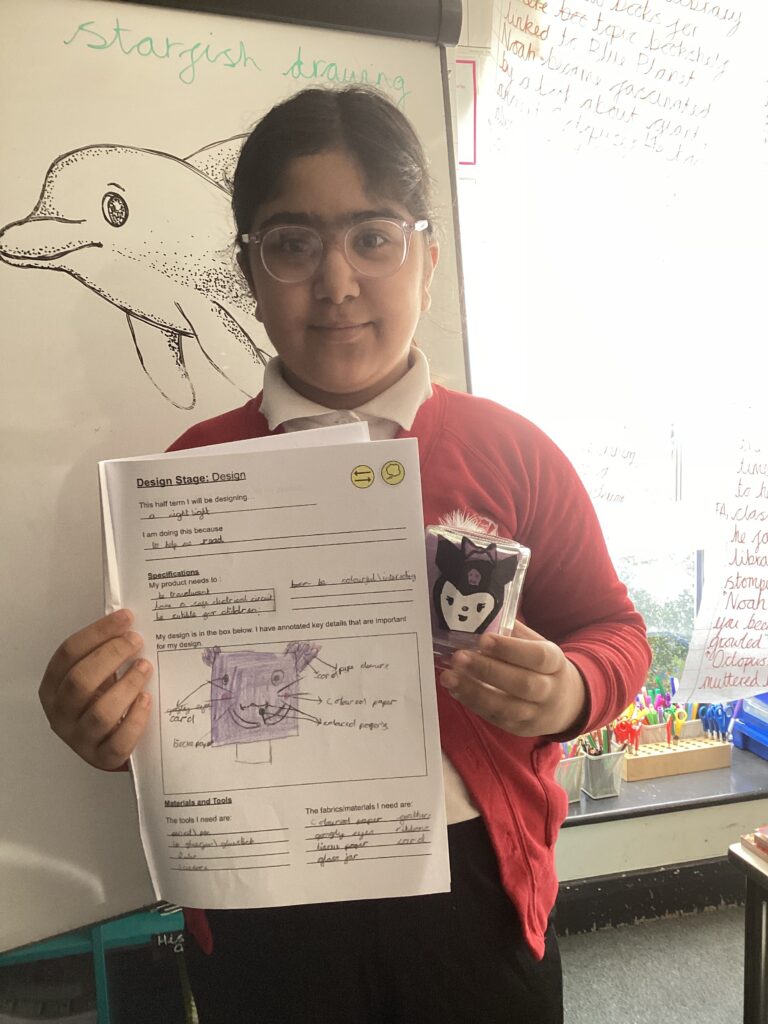 Year 4 designed and made night lights. They demonstrated planning and design abilities by creating ideas, drawing labelled sketches, and thinking carefully about how their product would look and function. They also evidenced practical making skills by using tools safely, measuring materials accurately, and assembling different parts with more confidence. During the project, they learned how to create a simple electrical circuit using a battery and a bulb, helping them understand how their nightlight would work. They demonstrated problem-solving skills by overcoming challenges, such as fixing parts that did not fit or troubleshooting when the light did not turn on. Finally, they reflected on their work by evaluating what went well and identifying areas for improvement. The children were very excited to try their night lights at home.